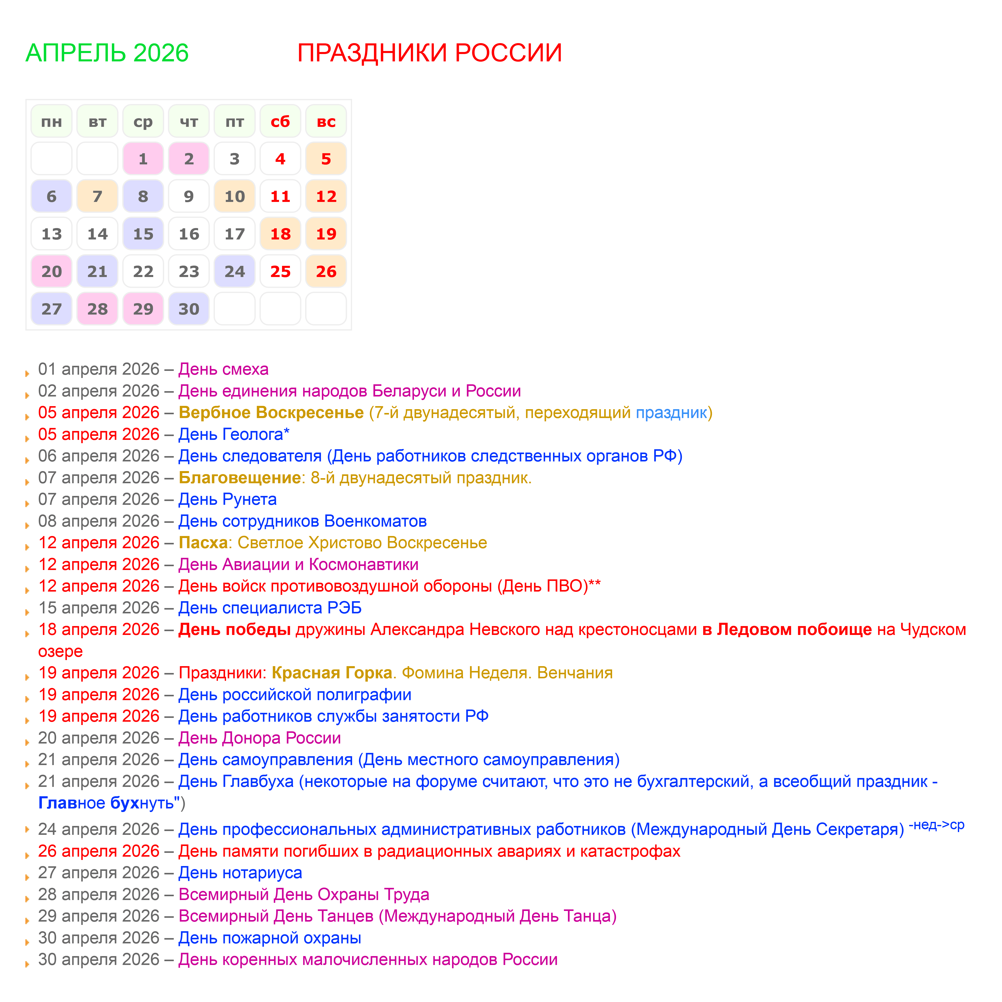 Для максимально быстого доступа к календарю праздников, создана отдельная HTML страничка-виджет:: Календарик: Праздники России в апреле 2026.